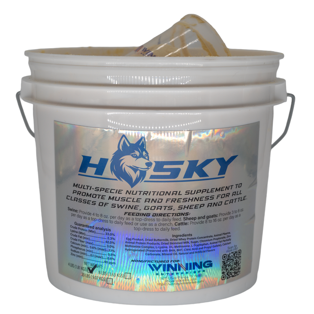 Sheep & Goats: 3–6 oz. per day, top-dressed on feed or given as a drench