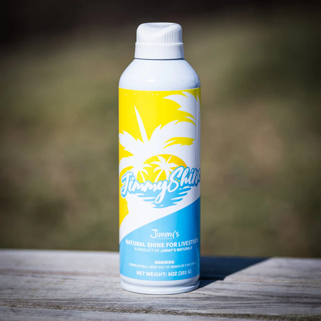 Jimmy Shine is designed to provide natural show day shine for all species of Livestock. Apply evenly over the entire body until desired shine is achieved. Can be brushed or combed into the skin & Hair. Does not need to be rinsed or washed off.